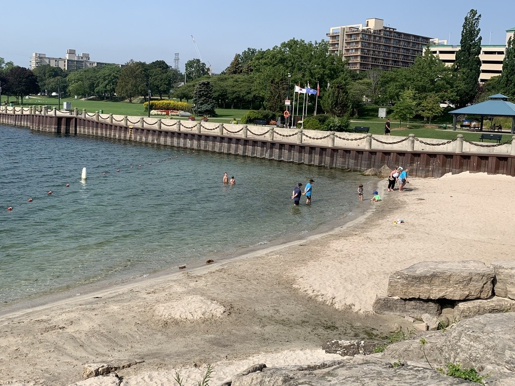The Brant Street Beach is at the foot of Brant St and part of Spencer Smith Park. It is a small beach with fine white sand and no lifeguard. The Brant St Pier is to the left and a sea wall stretches to the right above which is a boardwalk and promenade for walking, biking and in-line skating. It is part of the Waterfront Trail system that runs from Spencer Smith Park to Confederation Park in Hamilton. In the distance is the Burlington Canal Lift Bridge and the Beachway.