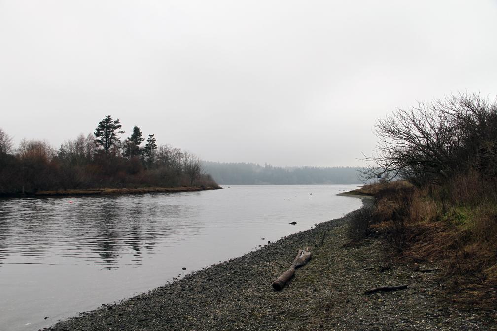 Esquimalt Lagoon is a saltwater lagoon located at the base of the Royal Roads University property in Colwood, approximately 7 kilometers to the west of downtown Victoria. This calm, shallow lagoon is a migratory bird sanctuary where a variety of birds, including ducks, swans, eagles and herons, can often be observed. The long strip of land that separates the lagoon from the ocean (Juan de Fuca Strait) is called Coburg Spit. This sand and gravel barrier stretches nearly 2 kilometers in length and protects the lagoon from the waves and winds off the ocean. The lagoon is connected to the ocean through a tidal channel at the northeast end of the spit. The ocean side of the spit is a long sandy beach with lots of driftwood that is a popular sunbathing spot in the summer. Access to the lagoon is from Ocean Boulevard, which runs the length of the spit and includes plenty of parking. There are washroom facilities at the southwest end of the spit.