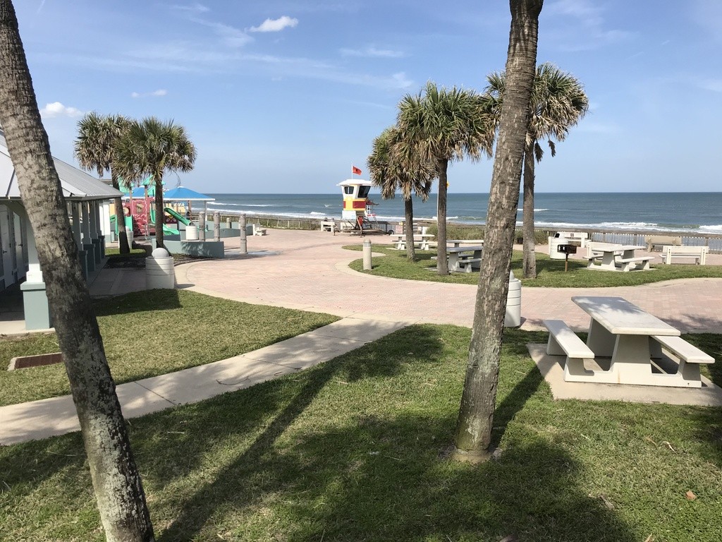Frank Rendon Beachfront Park is 2.25 miles north of Dunlawton Blvd located in the City of Daytona Beach Shores. It is open daily from Sunrise to Sunset. Restroom Facilities are available within one hour of sunrise to within one hour of sunset. Parking is prohibited from 11:00p.m. to 5:00a.m. It is a wheelchair accessible beachfront park owned by Volusia County. Day-to-day janitorial and grounds maintenance is performed by city staff. The park is a drive-on beach with over 130 parking spaces, restrooms, a playground, picnic pavilions, showers and bike racks. The elevation above the beach offers beautiful panoramic views of the Atlantic Ocean.