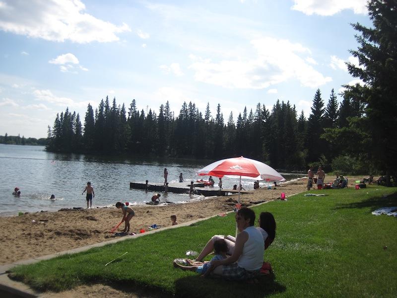 Memorial Lake is a long and odd shaped lake that is extremely popular for recreational use. It was voted best Regional Park in Saskatchewan in 2009! There is a $8 dollar fee to enter the park, or $40 annually for access to all Saskatchewan Regional Parks. The beach is about 150m long and is made of very fine sand – good for sand castles! The bottom of the lake is also sandy, and drops off quickly in the swimming area. The water has sand and other sediments in it, but is generally fairly clear. There is a designated swimming area marked by floating tubing, and all swimming is unsupervised.
