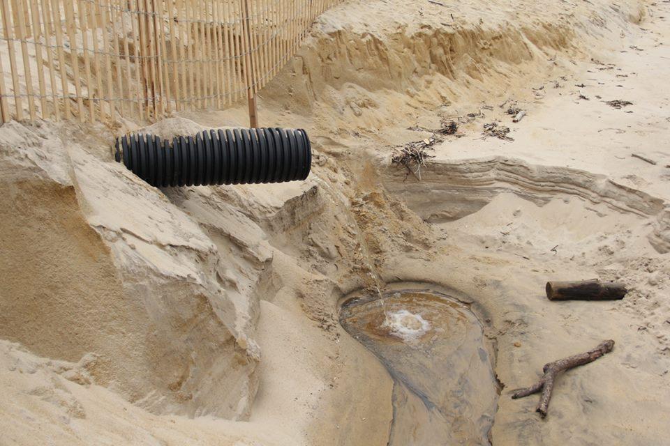 The Surfside Place Outfall Pipe releases storm water onto the beach. Surfrider and the Concerned Citizens of Montauk test the water coming from this pipe to measure bacteria levels in stormwater runoff
